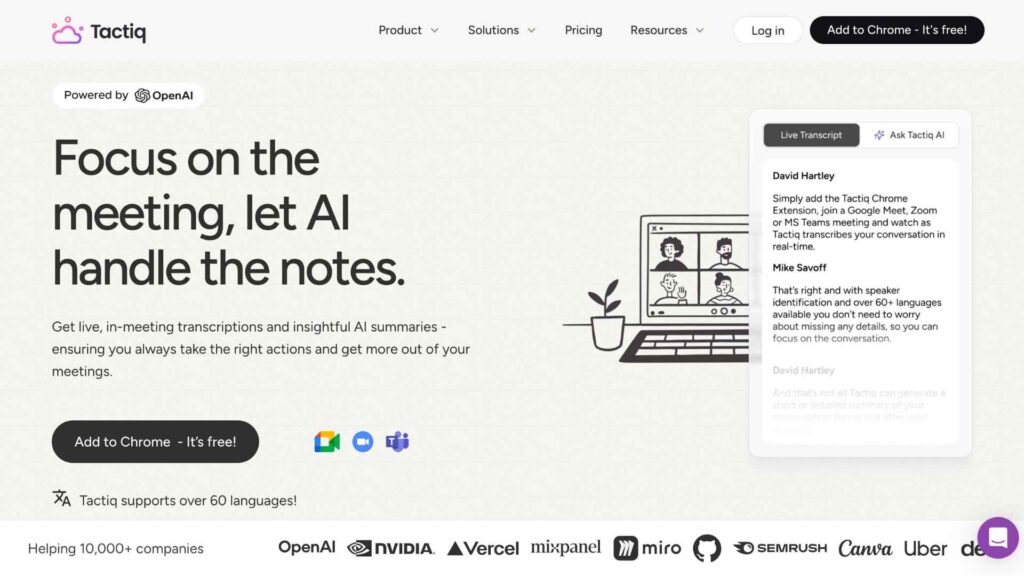Tactiq è uno strumento per catturare, trascrivere e sintetizzare automaticamente conversazioni da Zoom, Google Meet e Microsoft Teams, con estrazione di punti chiave e note utilizzabili subito. Il tutto senza che gli altri utenti se ne accorgano.